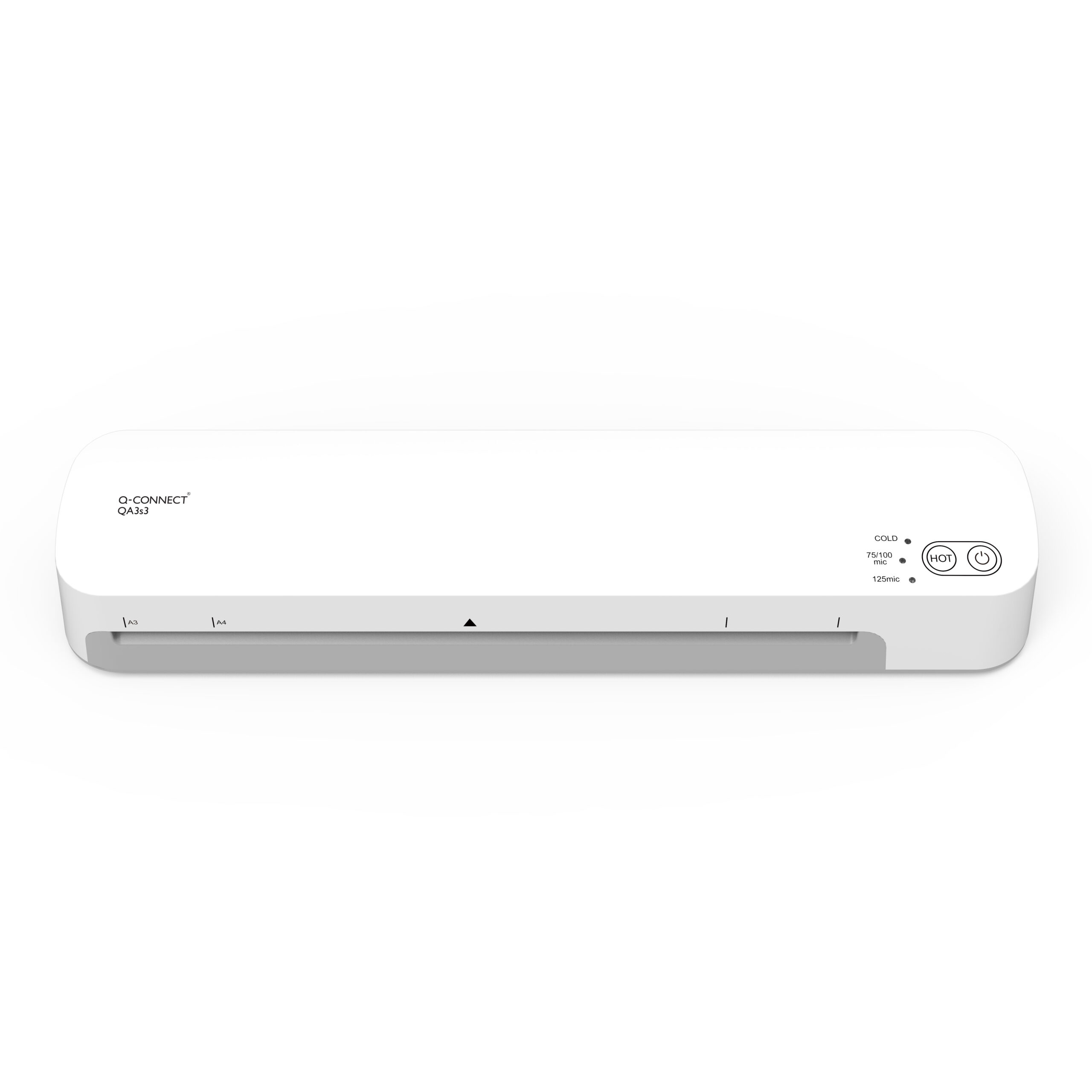 COMMERCIAL INFORMATION:Q-Connect A3 standard Laminator. Useful for laminating business cards, documents up to A4 in size. Short preheating time of 1 minute. Has a laminating speed of 420mm per minute and laminating range from 75 to 125mic. Maximum pouch width is 330mm. The laminator also has a Jam release at the back of the machine.