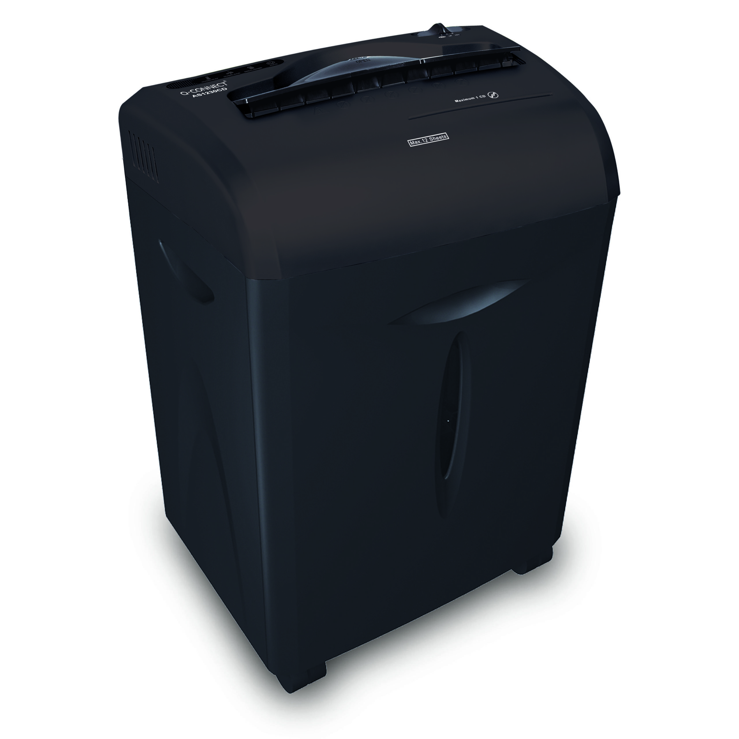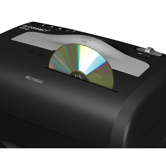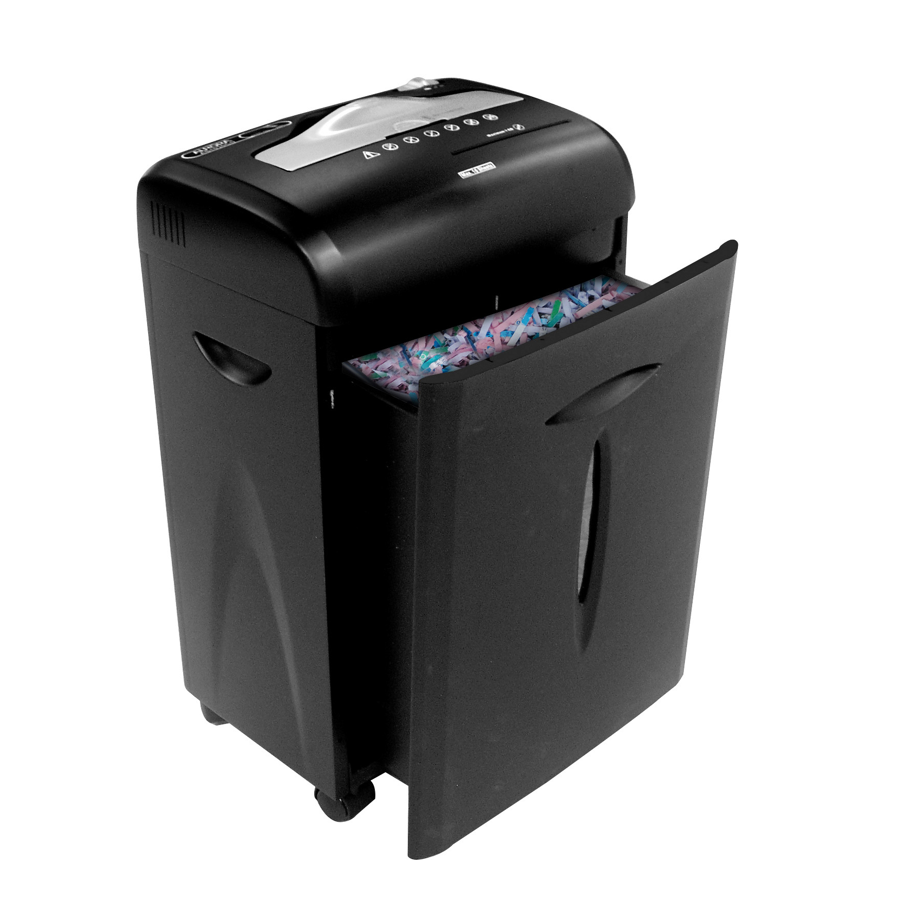 COMMERCIAL INFORMATION:Cross cut shredder shreds up to 12 sheets of 80gsm paper into 5.6 x 55mm particles. Auto start stop. Reverse in case of jams. Accepts CDs, credit cards, paper clips and staples. 230mm entry width. Safety cut out. 15 litre waste bin. Security level 3.