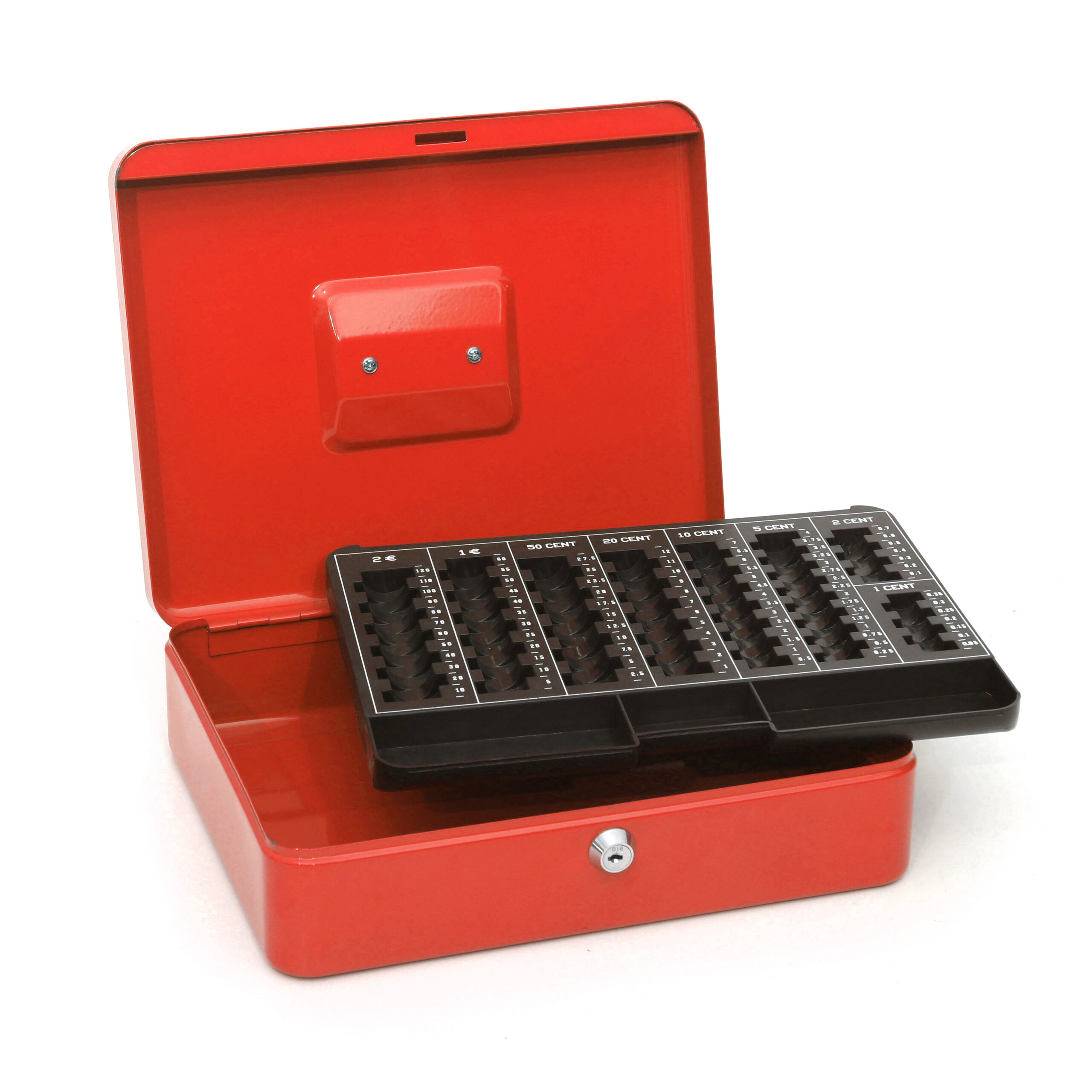COMMERCIAL INFORMATION:Twelve inch Cash Box with a removable Euro coin tray. The coin tray is divided into 1/2/5/10/20/50 cent and 1 & 2 euro compartments. The cash box is supplied with 2 keys. Dimensions: 240x300x90. Colour: Red