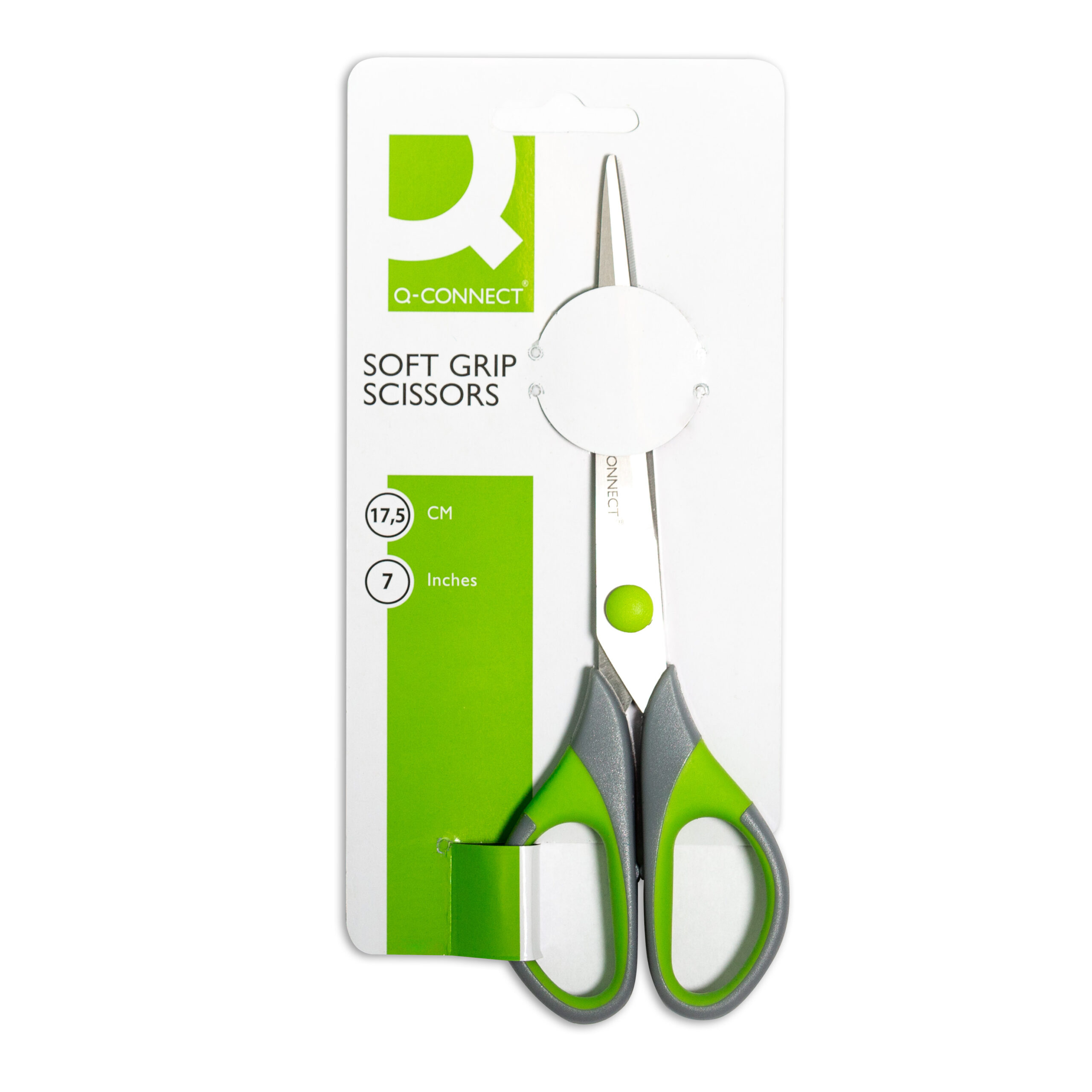 COMMERCIAL INFORMATION:The Q-CONNECT Soft grip Scissors are ergonomic with an excellent cutting quality. The curved soft grip handles make cutting papers and other materials comfortable and easy. Has a two/colored handle (grey/green). Can be used for both left & right handed. Length: 17,5cm (7")