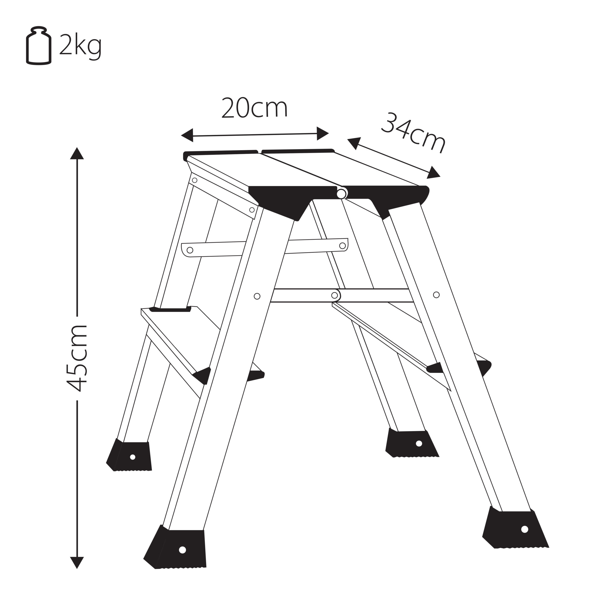COMMERCIAL INFORMATION:Q-Connect lightweight alu step ladder with 2 steps. Features spring loaded casters that retract once weight is applied to the stool. Ideal for warehouse retail office or domestic use. Height: 45cm.