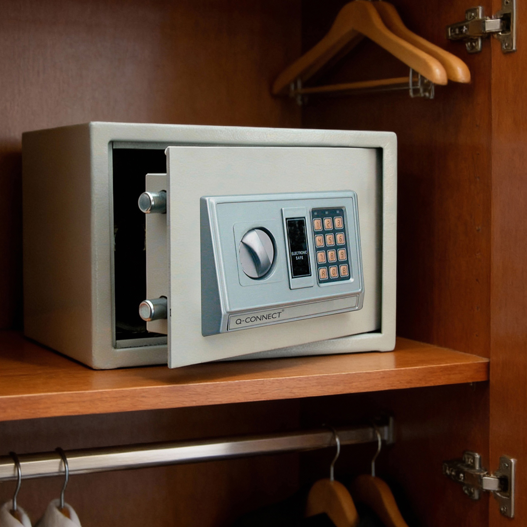 COMMERCIAL INFORMATION:Q-Connect electronic locking safe with concealed emergency key override, electronic keypad, 2 sets of combination code, 3 minute auto lock, low battery warning, fixing holes for wall or floor. 10 litre capacity. External dimensions: W310 x D200 x 200mm. Internal dimensions: W306 x D140 x H196