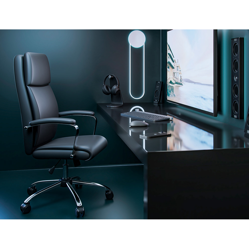 COMMERCIAL INFORMATION:Q-Connect Leo Office chair. Executive office chair with a high back support, integrated headrest and seating made out of foam covered with high quality faux leather for absolute comfort and high-end look. Is height-adjustable and has a butterfly mechanism for absolute freedom of movement. Has padded chrome armrests and a metal chrome plated base with 5 castors for stable and easy movement. Color: Black