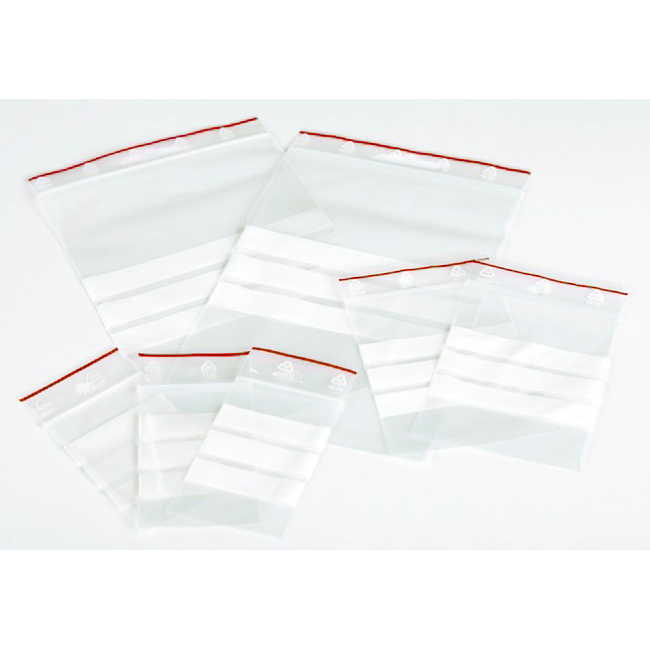 Re-sealable grip bags with White write-on stripes, a red line and 6mm punched hole above the seal, 60x80mm, 50micron - packed per 100bags