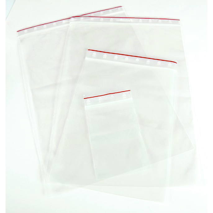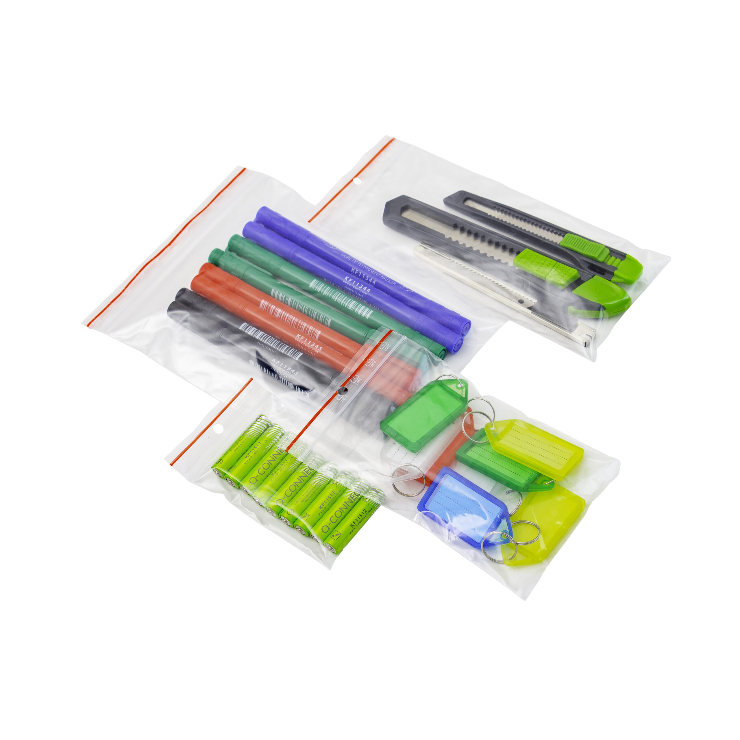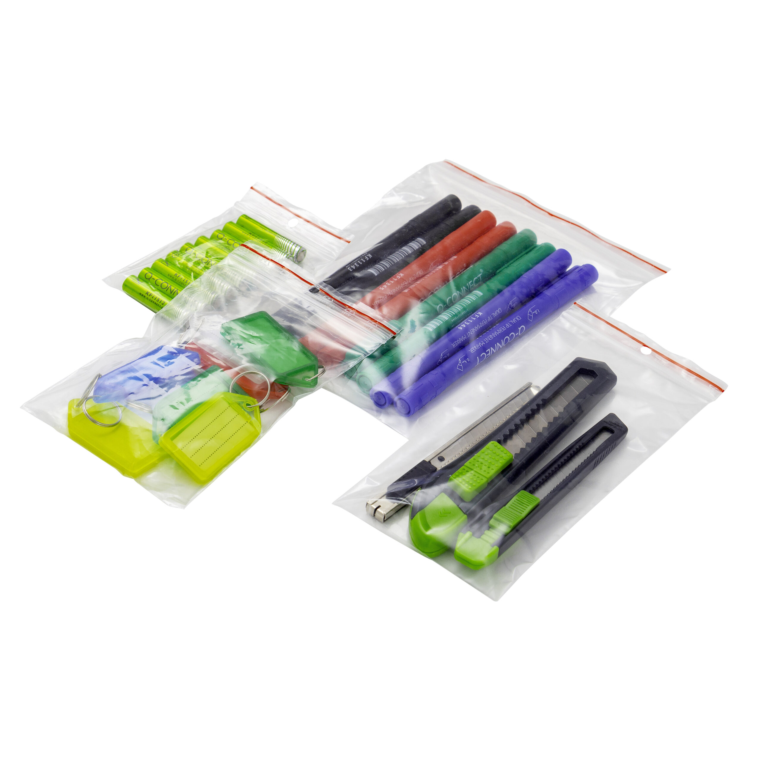 Plain re-sealable bags with red line and euroslot above the seal, 100x150mm, 50micron - packed per 100bags