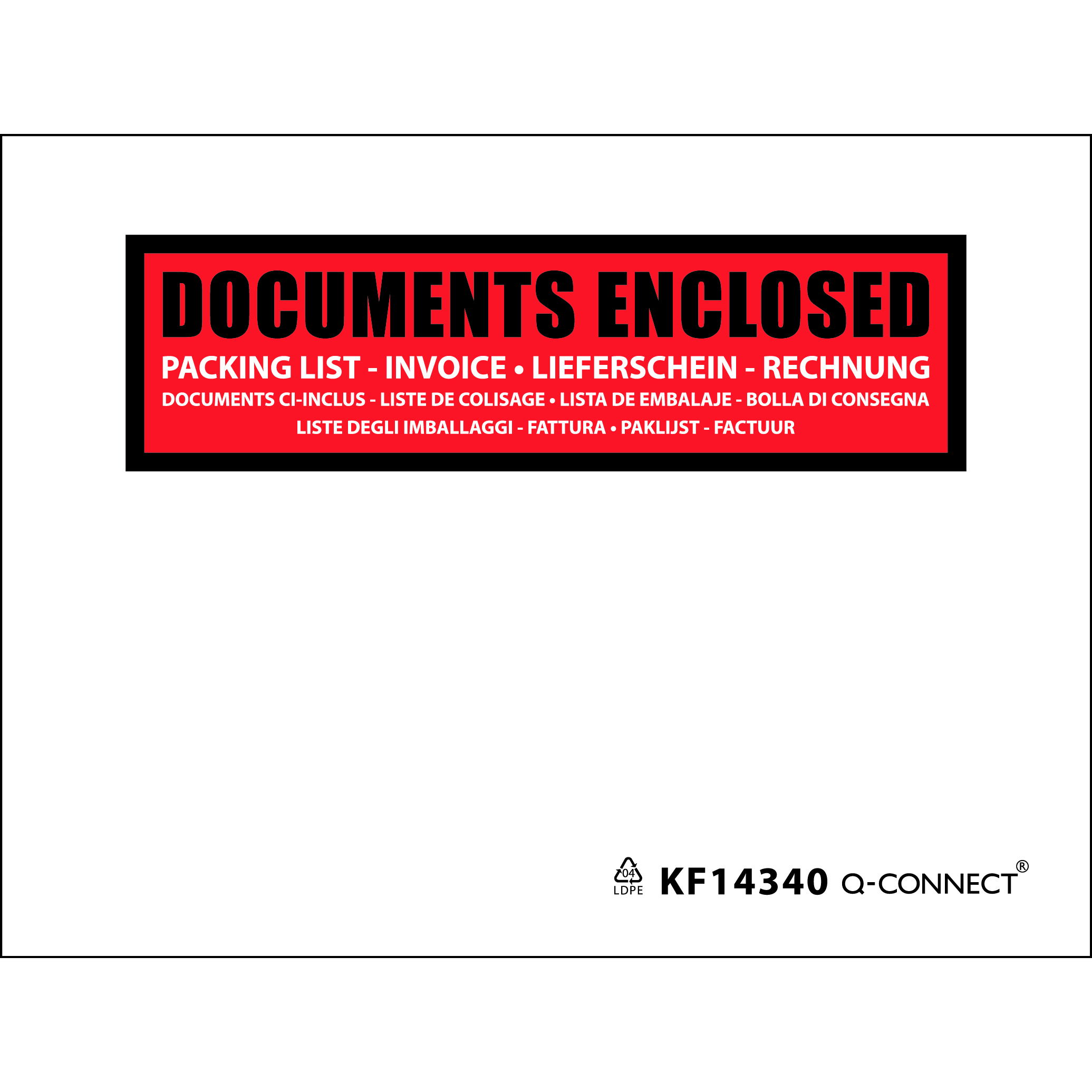 COMMERCIAL INFORMATION:Q-Connect self adhesive DOCUMENT ENCLOSED packing list envelopes. Format C6. Clear LDPE top- and back film, top film is 30mic and the back film is 25mic. The packing list envelopes have an FSC certified release paper. The envelopes have 'documents enclosed' printing on the top film. Ideal to attach documents to your packages. 4x 250 envelopes per box.