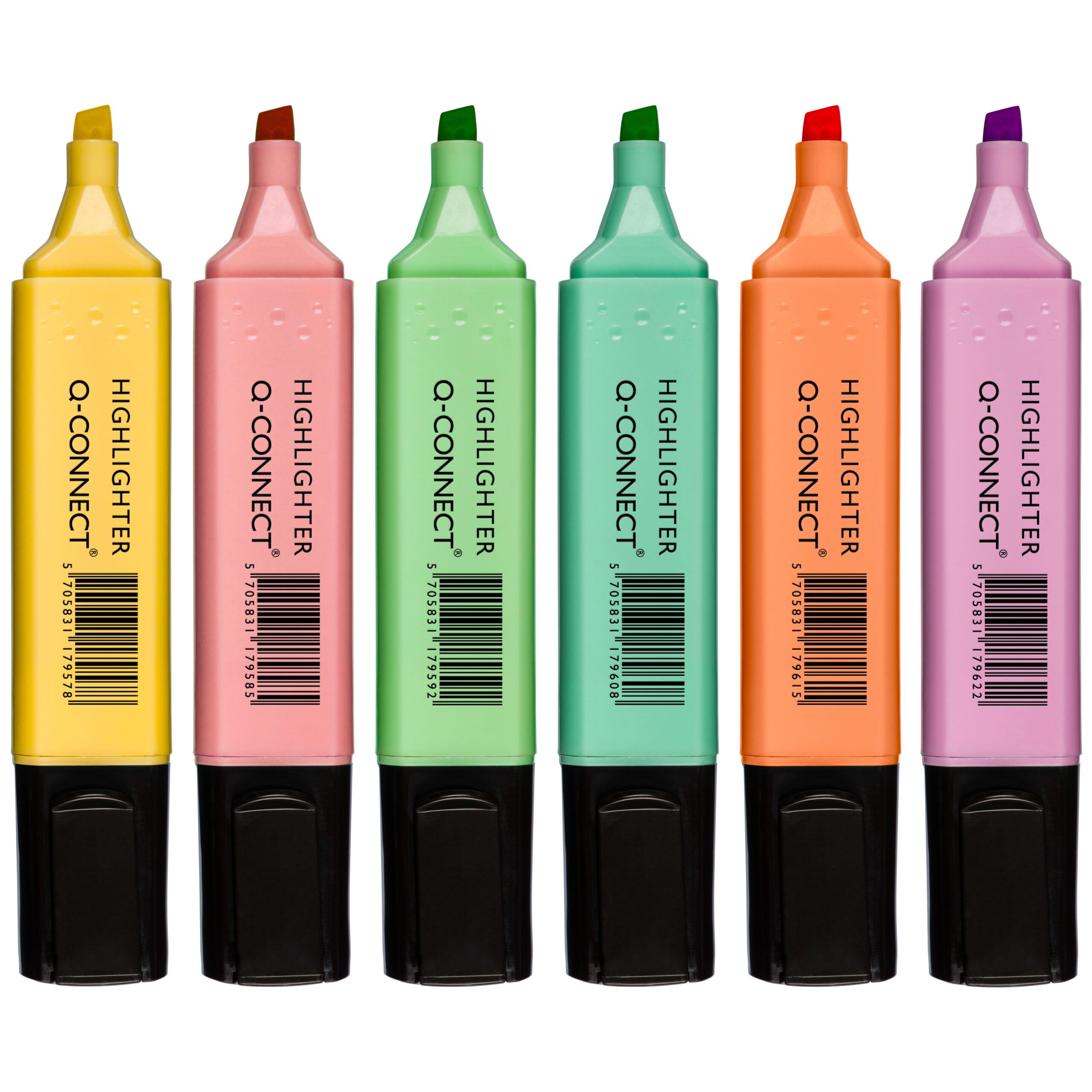 COMMERCIAL INFORMATION:Q-Connect Highlighter Pen. The chisel tip draws both broad lines for highlighting or narrow lines for underlining. Suitable for most papers and will not fade on fax paper. Wallet of 6 assorted colours - Yellow, Green, Orange, Blue, Red and Violet.