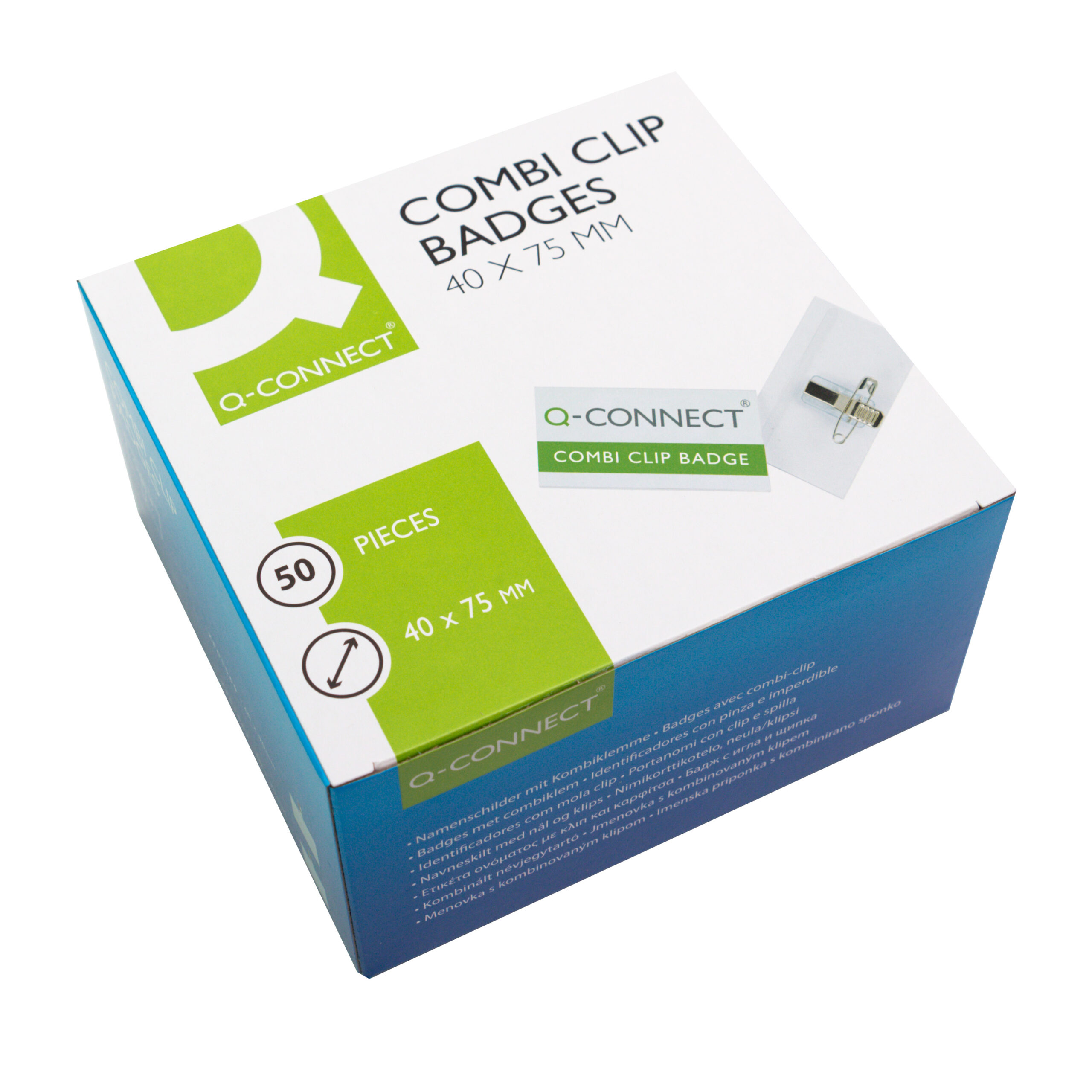 COMMERCIAL INFORMATION:Q-Connect Name Badges with Combi Fastening. PVC badges to suit all occasions. Features transparent covers to protect but display name cards clearly and a pin/crocodile clip fastening on the reverse. Supplied complete. Size: 40x75mm.