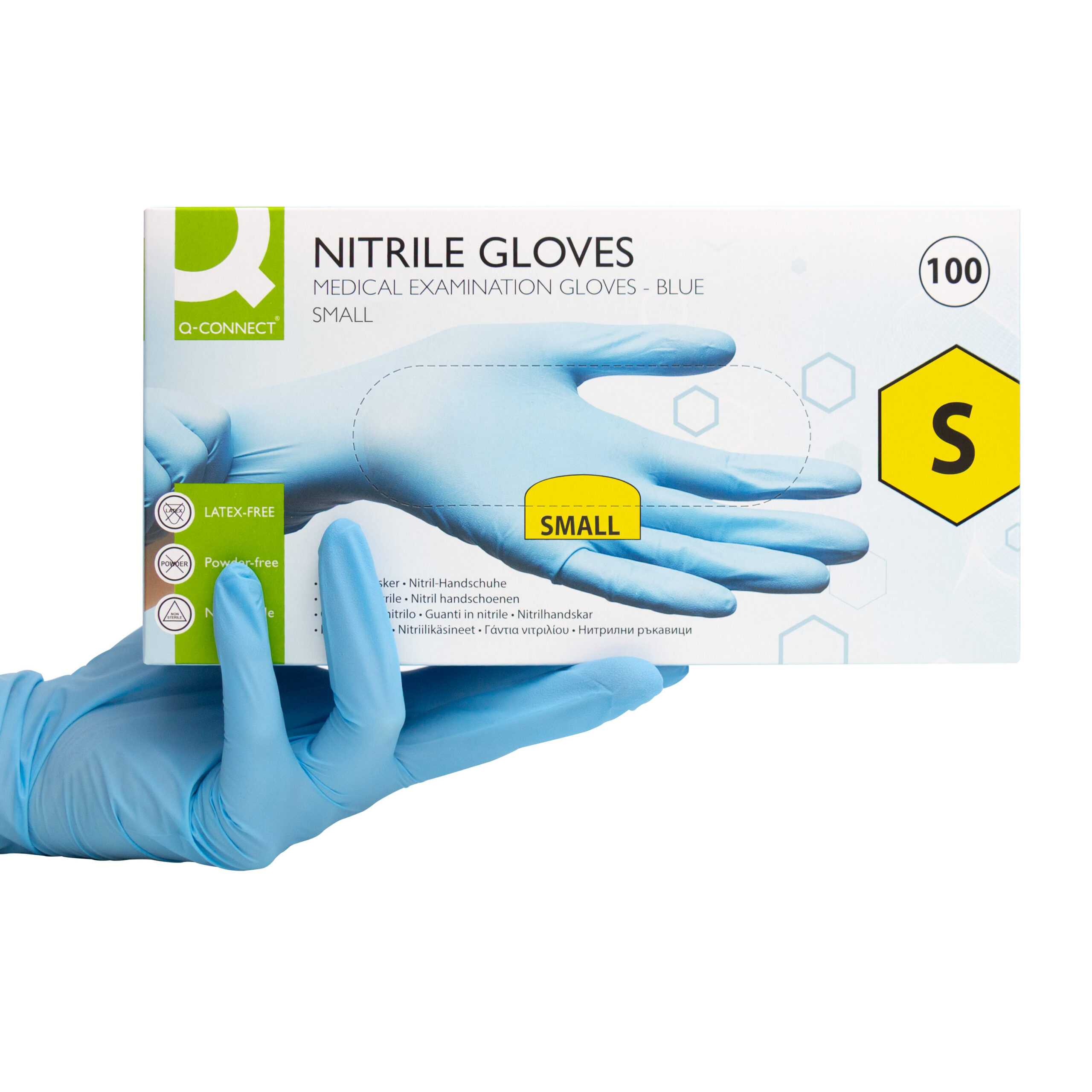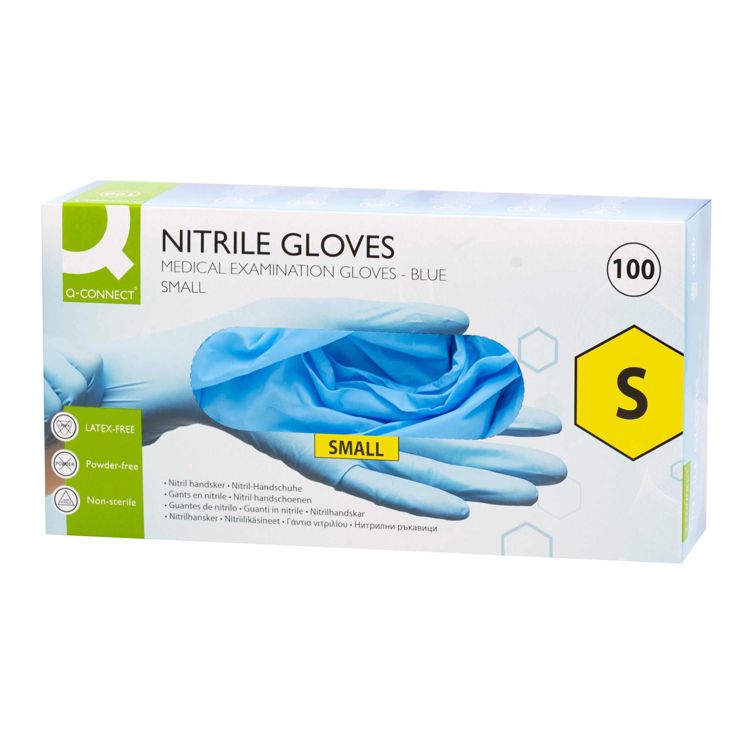 COMMERCIAL INFORMATION:Q-Connect non-sterile nitrile examination gloves. The gloves are MDR class I, as well as PPE category III. Have a latex free formulation and are powder free to prevent allergic reactions. They have a micro textured surface for a secure grip, are super soft and are fatique free. The disposable gloves are food-safe, strong, elastic and snug-fitting. They come in a box of 100 Blue gloves per size (XS/S/M/L/XL)
